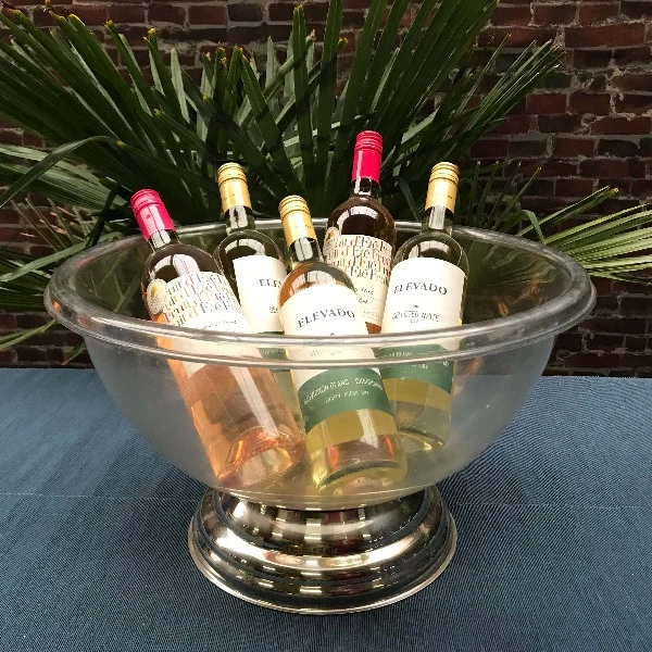 Ontdek onze ruime Champagnekoeler van polycarbonaat of roestvrij staal, beschikbaar voor verhuur. Met zijn elegante ontwerp houdt deze grote koeler meerdere flessen champagne koel, perfect voor het serveren van drankjes op feesten, bruiloften en andere speciale gelegenheden.