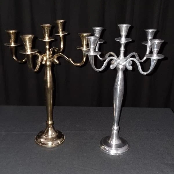 Voeg een vleugje elegantie toe aan je evenement met onze luxe zilveren kandelaar. Met zijn 5-armige ontwerp straalt deze kandelaar klasse en stijl uit. Perfect voor bruiloften, diners en andere speciale gelegenheden. Voeg een warm en sfeervol accent toe aan elke ruimte met deze prachtige blikvanger.