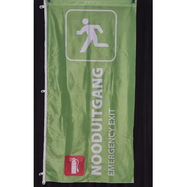 Ontdek onze nooduitgangvlag, essentieel voor veiligheid op evenementen. Gemaakt van duurzaam materiaal, deze heldere en opvallende vlag is gemakkelijk te herkennen in noodsituaties. Een must-have voor elke locatie om nooduitgangen snel en duidelijk aan te geven voor een snelle evacuatie.