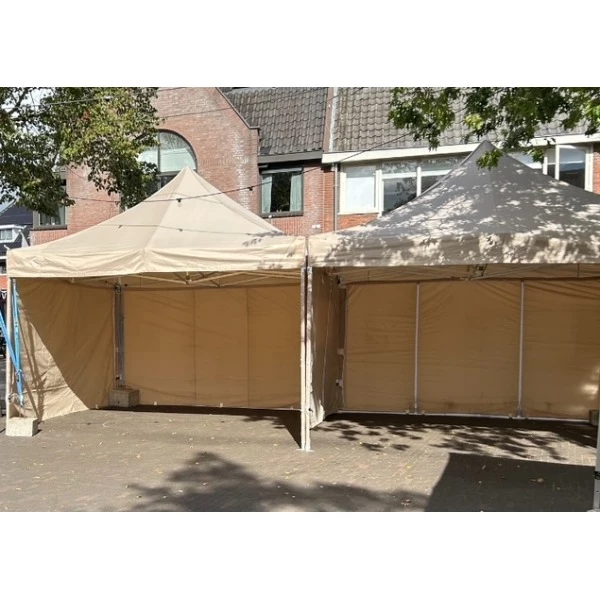 Ontdek onze veelzijdige zand Easy Up pagodetent van 4x4 meter, beschikbaar voor verhuur en perfect voor allerlei evenementen. Met zijn eenvoudig opzetbaar ontwerp biedt deze tent een snelle en handige oplossing voor het creëren van een overdekte ruimte. Ideaal voor bruiloften, feesten, markten en andere bijeenkomsten waar stijl en functionaliteit belangrijk zijn. Met zijn een zand kleur voegt deze pagodetent een moderne en elegante uitstraling toe aan elke setting, terwijl het ruime formaat voldoende ruimte biedt voor al uw gasten. Laat ons uw evenement naar een hoger niveau tillen met onze Easy Up pagodetent van 4x4 meter.
