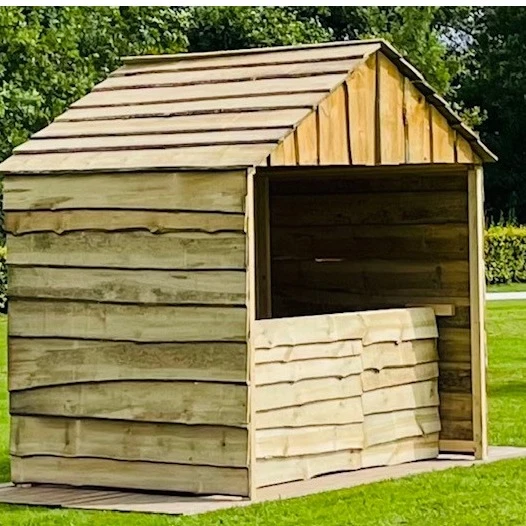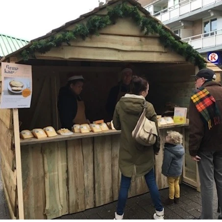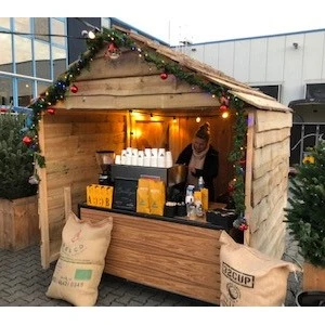 Winterhuisje / Stube 250cm breed, 170cm diep, 240cm hoog en voorzien van een achterdeur. Deze huisjes zetten wij vaak in op markten / braderieën / fairs of voor verkoop / uitdeel / promotie doeleinden.